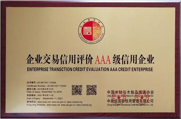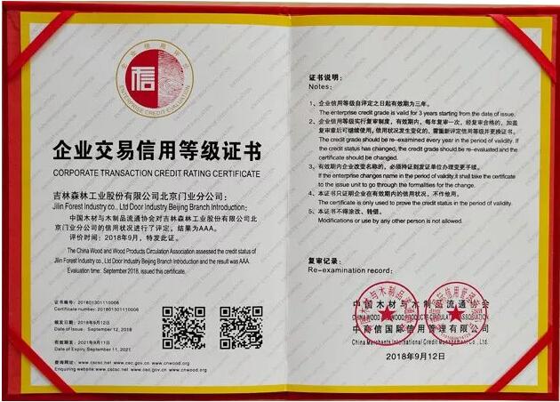 2018年9月12日,經(jīng)過中國木材與木制品流通協(xié)會與第三方信用管理服務(wù)機構(gòu)的嚴(yán)格審核,吉林森林工業(yè)股份有限公司北京門業(yè)分公司(即北京霍爾茨門業(yè))榮獲“AAA級企業(yè)信用等級”證書。此次企業(yè)信用交易等級評估是對霍爾茨門業(yè)開展企業(yè)交易信用能力和企業(yè)經(jīng)營綜合健康狀況等方面的綜合評價,憑借其良好的信用記錄、先進的管理模式、以及“質(zhì)量強企”的發(fā)展戰(zhàn)略,北京霍爾茨門業(yè)順利通過各項評估,榮膺“企業(yè)交易信用評價AAA級信用企業(yè)”。