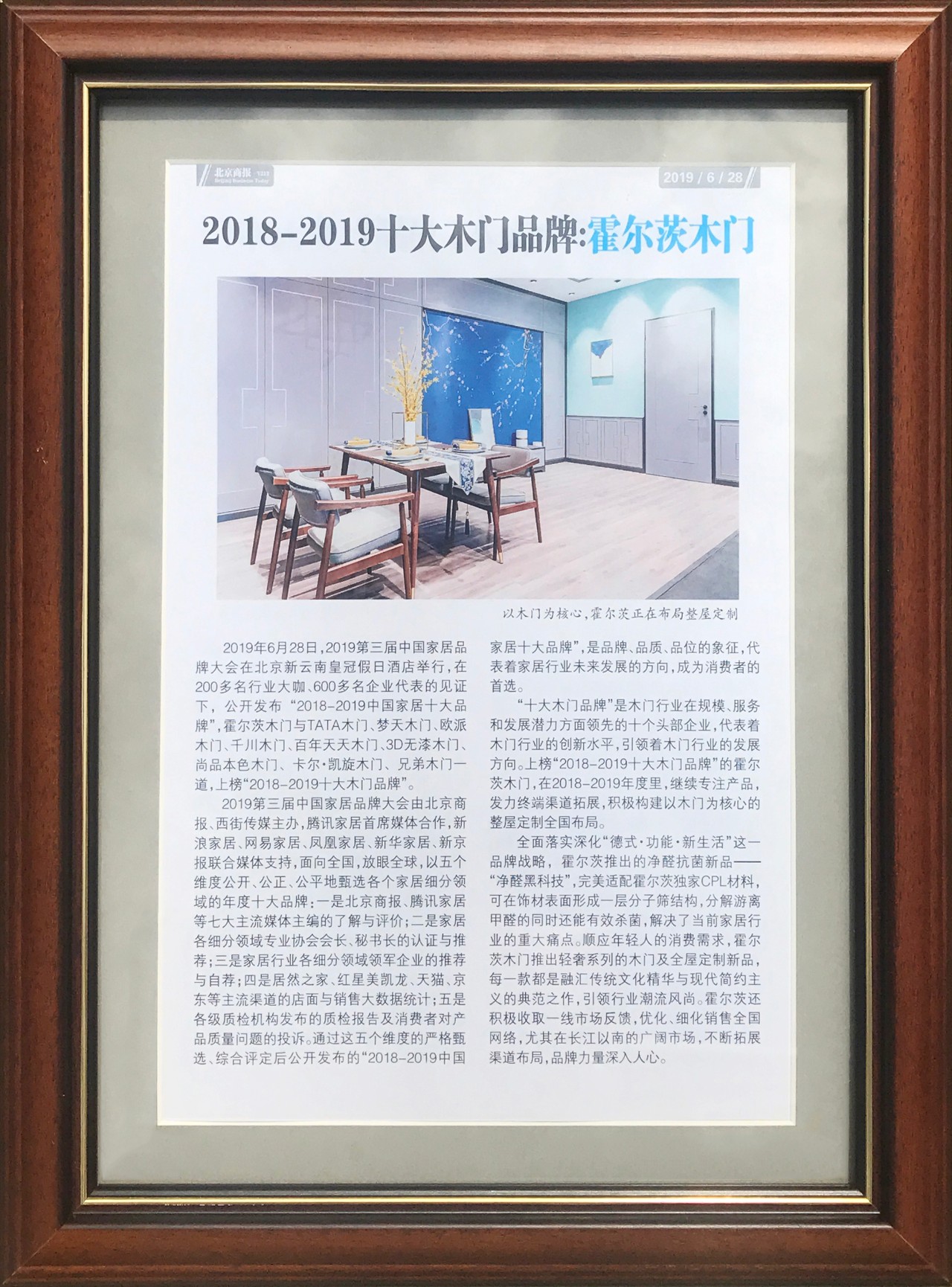 2019年6月28日,2019第三屆中國家居品牌大會暨2018-2019中國家居十大品牌發(fā)布會在北京新云南皇冠假日酒店隆重開幕,在200多名行業(yè)大咖、600多名企業(yè)代表的見證下,北京商報正式發(fā)布 “2018-2019中國家居十大品牌”,33個榜單、330個品牌。其中霍爾茨木門憑借在木門領(lǐng)域的影響力榮膺 2018-2019中國家居十大木門品牌。