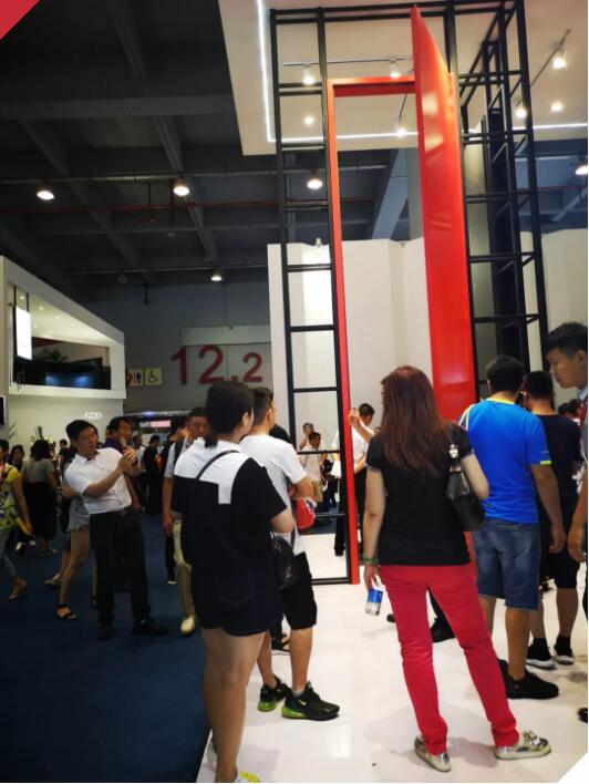 展廳入口是兩扇4.8米高的單開室內(nèi)門,濃艷的中國紅與沉穩(wěn)的黑理石,以工業(yè)風(fēng)氛圍濃厚的簡約設(shè)計陪襯,彰顯了不一樣的時尚態(tài)度,來往者紛紛聚在此處,用高大上又顏值過關(guān)的木門為背景,拍照打卡,不亦樂乎。展廳的內(nèi)在布置也均以不繁復(fù)的鋼管架構(gòu)為陳設(shè),眾多材質(zhì)、花色、造型不一的木門展品用以非常規(guī)的規(guī)模呈現(xiàn),2.8米的高度與更加高大的灰色背景形成對比,加之燈光、軟裝等道具的映襯,極具質(zhì)感和時尚感的霍爾茨時尚木門耀眼奪目。尤其是霍爾茨木門的新品——輕奢系列和凈醛門系列,輕奢系列是萊德門系列的升級款,北歐簡約中自有奢適氣韻,更加貼合主流年輕群體的審美需求;凈醛門系列則是自問世以來首度亮相南方市場,“凈醛黑科技”的融入讓凈醛門的外表與普通木門別無二致,絲毫不會妨礙其美觀性和時尚性。