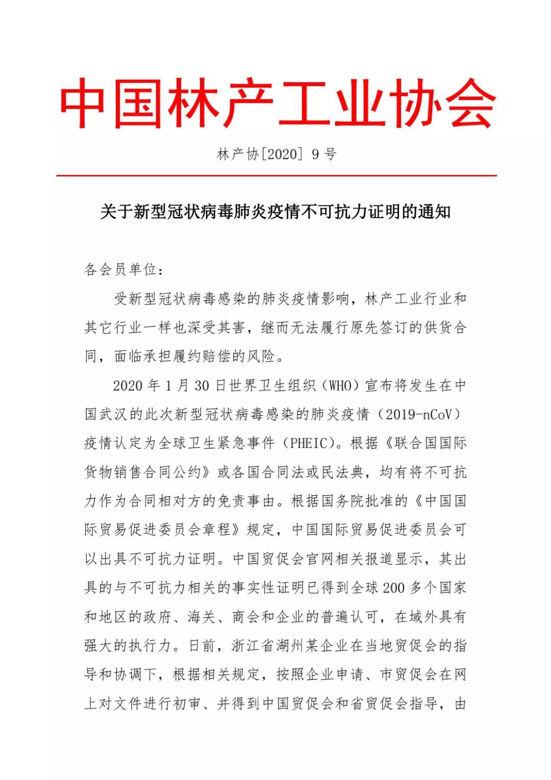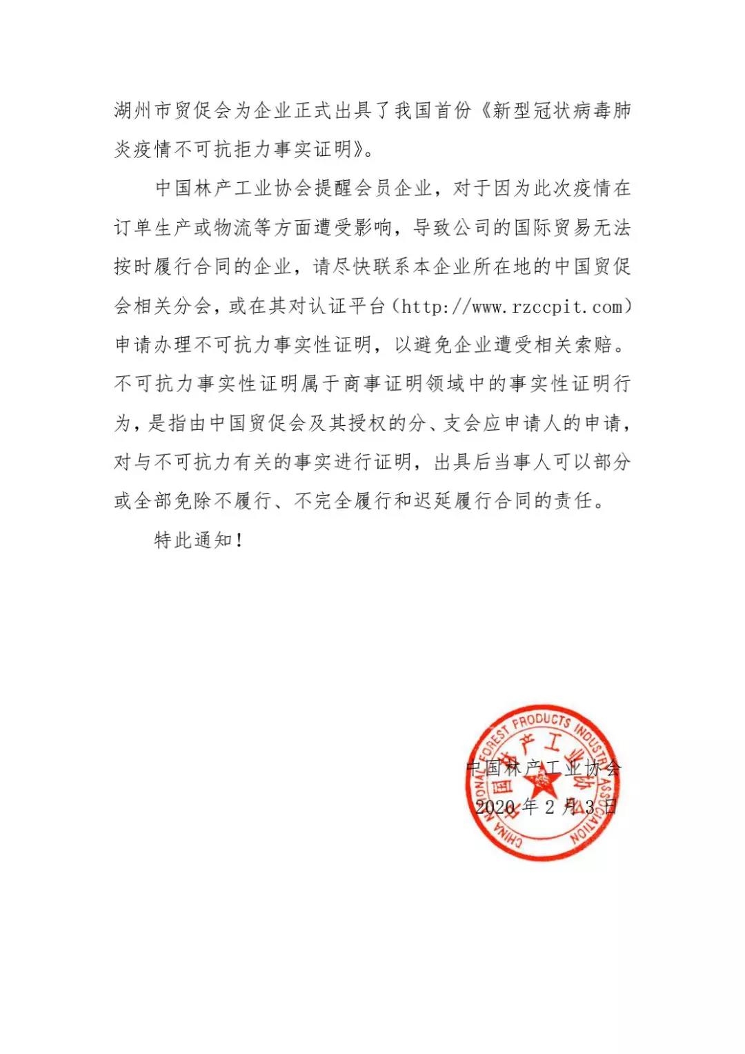 中國林產(chǎn)工業(yè)協(xié)會日前發(fā)布《關(guān)于新型冠狀病毒肺炎疫情不可抗力證明的通知》,提醒會員企業(yè)對于因此次疫情在訂單生產(chǎn)或物流等方面遭受影響,導(dǎo)致公司的國際貿(mào)易無法按時履行合同的企業(yè),盡快聯(lián)系本企業(yè)所在地的中國貿(mào)促會相關(guān)分會,或在其認證平臺(http://www.rzccpit.com)申請辦理不可抗力事實性證明,以避免企業(yè)遭受相關(guān)索賠。