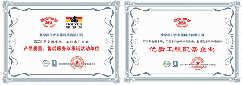 2020年6月18日,中國木材與木制品流通協(xié)會木門窗專業(yè)委員會年會上,憑借對產(chǎn)品的精益求精、服務(wù)標準的強有力執(zhí)行與貫徹、生態(tài)環(huán)保理念的深入發(fā)展等優(yōu)勢,北京霍爾茨家居科技有限公司再次榮獲“2020年全國市場、工程木門企業(yè)產(chǎn)品質(zhì)量、售后服務(wù)雙承諾活動單位”榮譽稱號,并依托自身完善的體系建設(shè)以及強大的技術(shù)支持,被授予“優(yōu)質(zhì)工程配套企業(yè)”榮譽。
