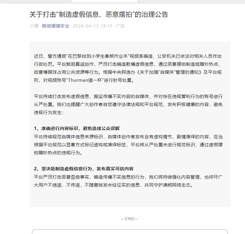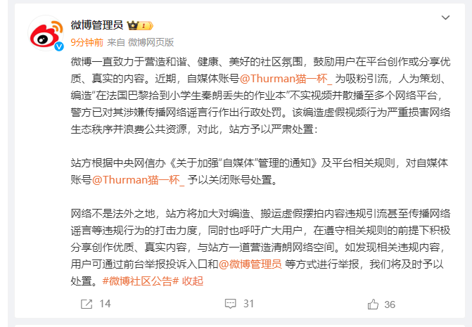 微博一直致力于營造和諧、健康、美好的社區(qū)氛圍,鼓勵用戶在平臺創(chuàng)作或分享優(yōu)質(zhì)、真實的內(nèi)容。近期,自媒體賬號@Thurman貓一杯_ 為吸粉引流,人為策劃、編造“在法國巴黎拾到小學(xué)生秦朗丟失的作業(yè)本”不實視頻并散播至多個網(wǎng)絡(luò)平臺,警方已對其涉嫌傳播網(wǎng)絡(luò)謠言行作出行政處罰。該編造虛假視頻行為嚴(yán)重?fù)p害網(wǎng)絡(luò)生態(tài)秩序并浪費公共資源,對此,站方予以嚴(yán)肅處置: